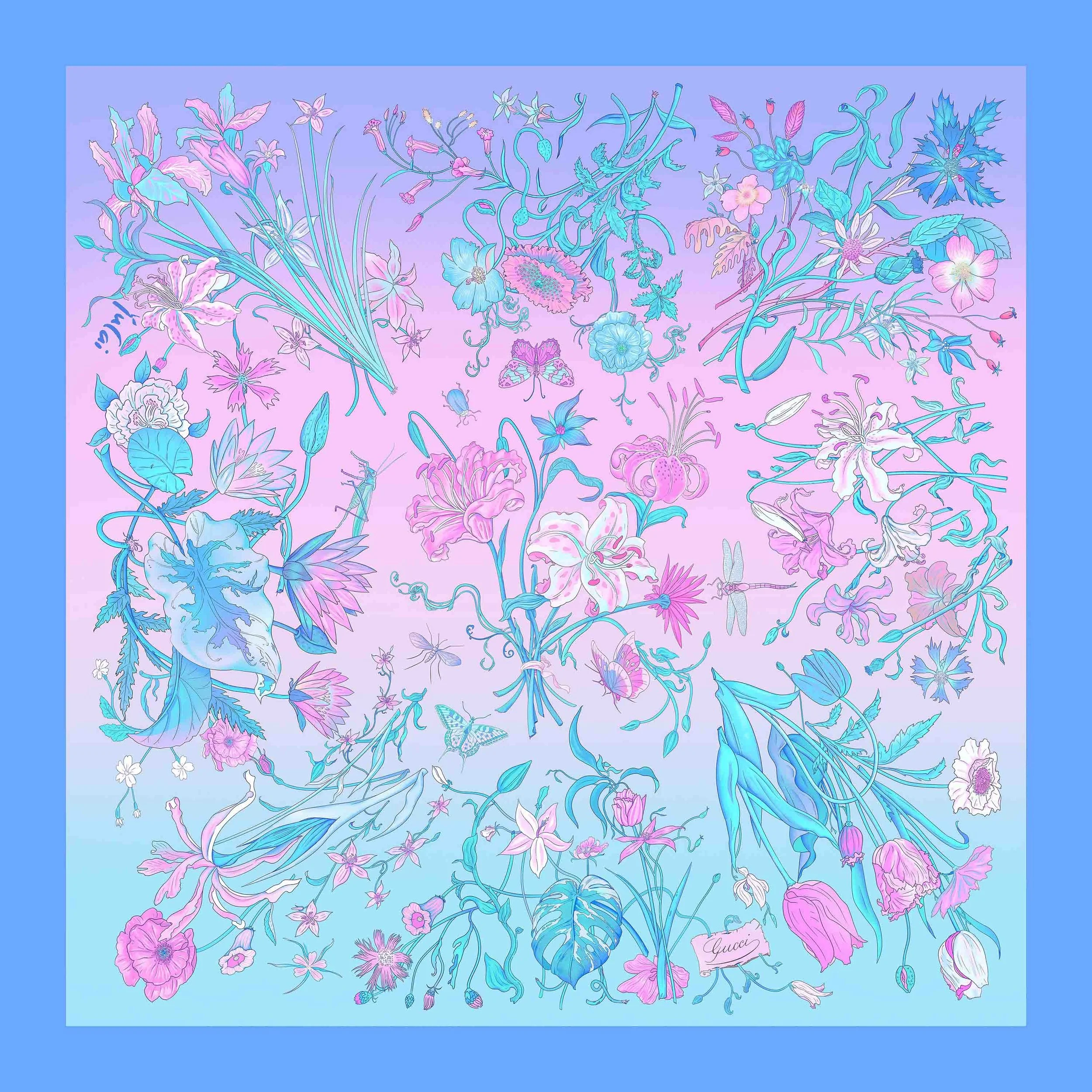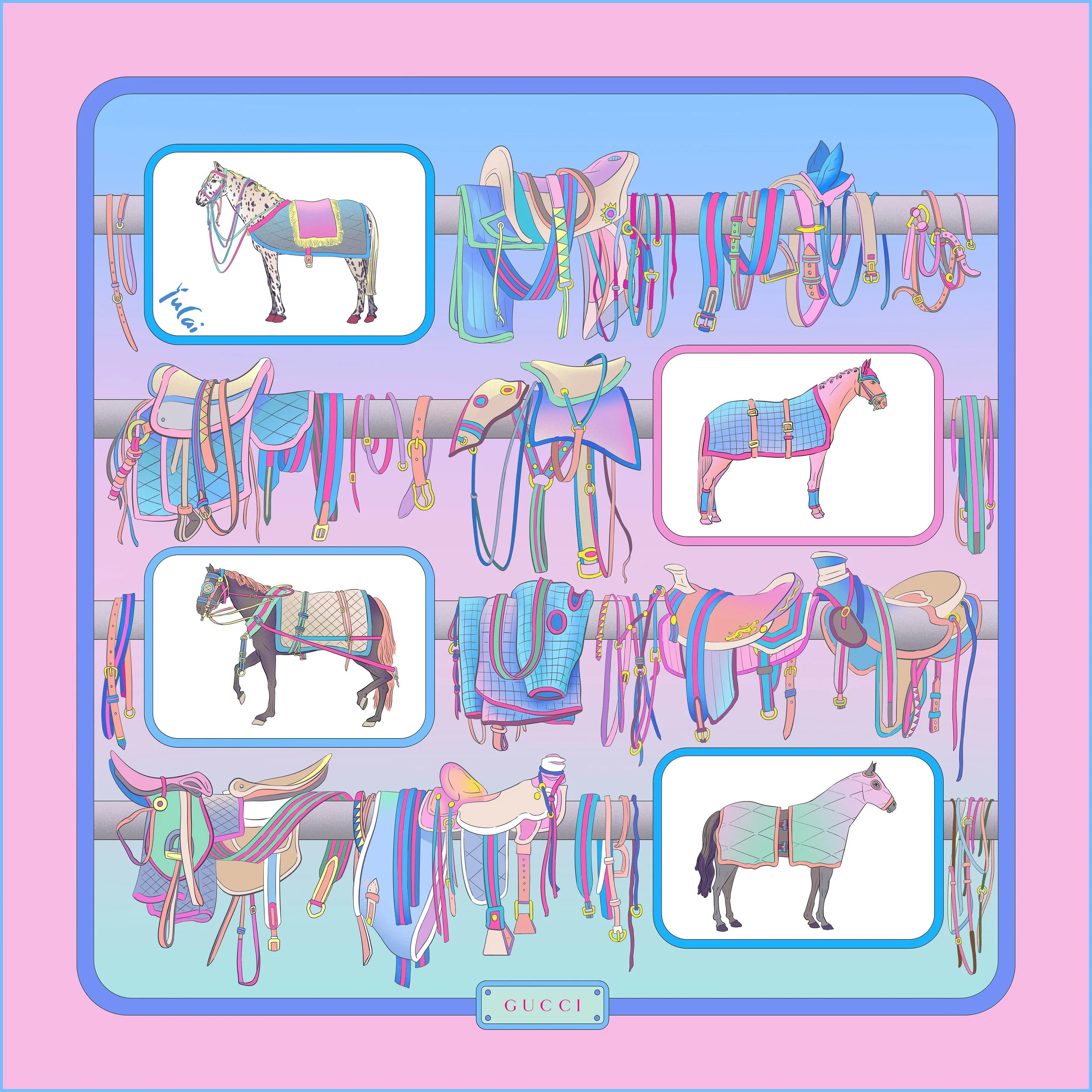 Collaboration with Gucci on the 90 x 90 project, Yu Cai reinterprets five enduring themes—Flora, Fauna, Nautical, Equestrian, and the GG Monogram—as a contemporary tribute to Gucci’s silk legacy.